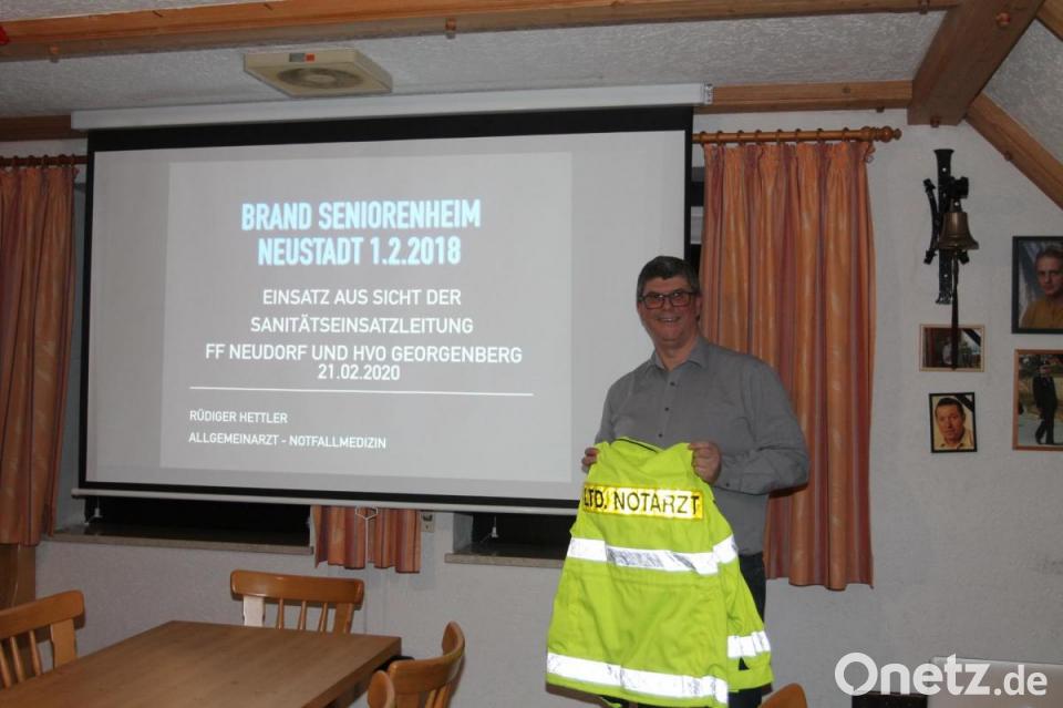Den Brand im Seniorenheim in Neustadt/WN am 1. Februar 2018 hat die Feuerwehr Neudorf zum Anlass genommen, mit Rüdiger Hettler den Ablauf des gesamten Einsatzes zu besprechen. Der Kreisfeuerwehrarzt, zudem Kommandant der Patenfeuerwehr Altenhammer, schilderte in seinen Ausführungen den gesamten Ablauf, beginnend mit der Alarmierung um 0.53 Uhr, bis zum Ende gegen 20 Uhr aus der Sicht des leitenden Notarztes, der zusammen mit dem organisatorischen Leiter des Rettungsdienstes für die Sanitätseinsatzleitung verantwortlich ist.