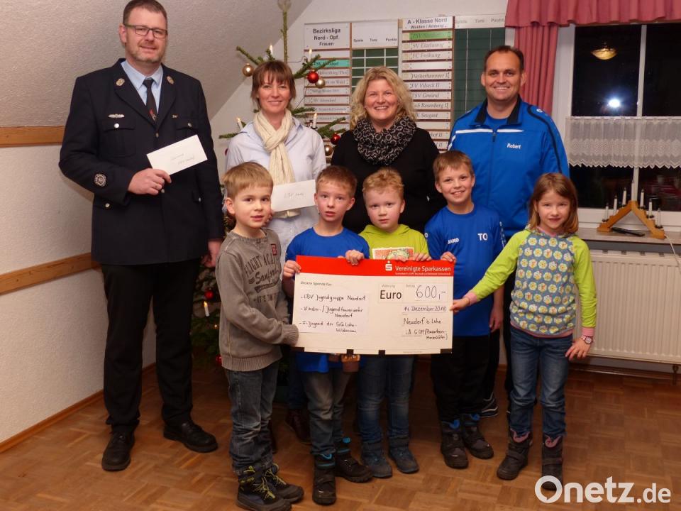 In diesem Jahr bekamen die verschiedenen Helfergruppen eine Spende. Die Basarleiterin, Simone Ott aus Neudorf, hatte zur Spendenübergabe ins TSV-Sportheim nach Neudorf eingeladen. In diesem Jahr wurde das Team von der LBV-Jugendgruppe, der Kinder- und Jugendfeuerwehr aus Neudorf und der F-Jugend des SG Luhe-Wildenau tatkräftig unterstützt. Ohne diese vielen Helfer außerhalb des Basarteams wäre die Belastung für das Team noch wesentlich höher. Ott überreichte mit Martina Weiß an die Gruppen jeweils 200 Euro. Für die Feuerwehr-Jugend erschien Kommandant Michael Klaschka, für den LBV Martina Weiß und für die F-Jugend Robert Ott. Mit der Spende verbunden war der Dank für die Unterstützung bei den Basaren.