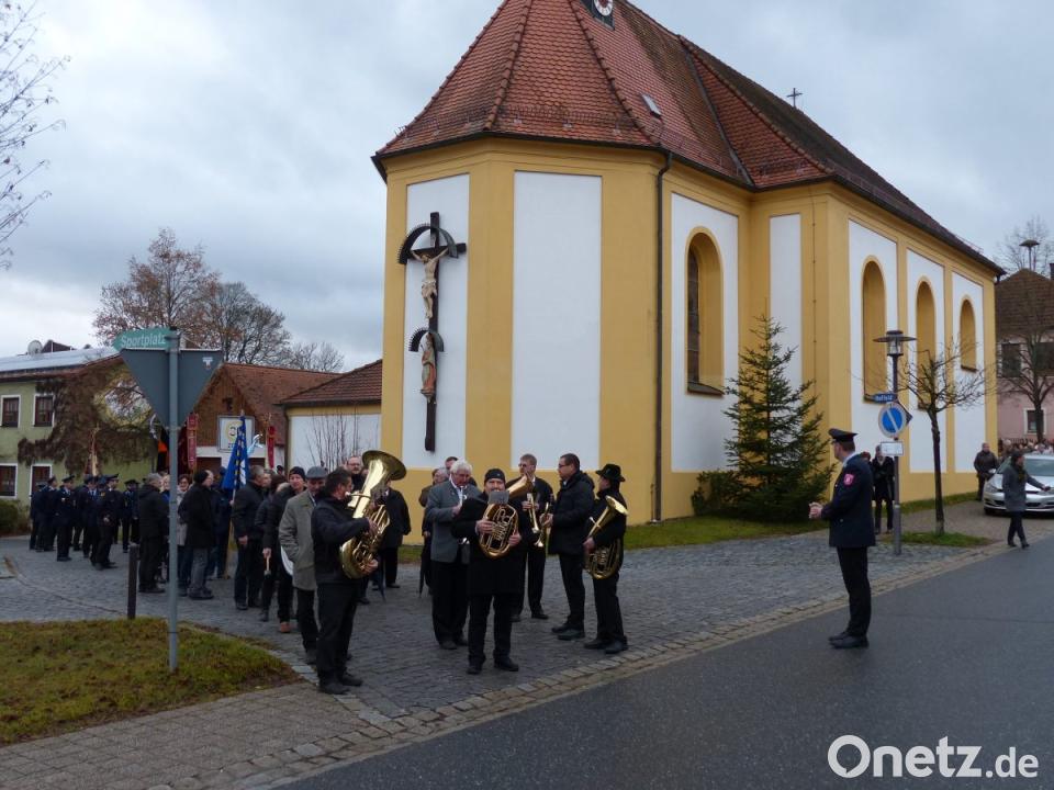 Die Vereine aus der gesamten Marktgemeinde, die Vertretungen der Kirche und der Marktgemeinderat in Begleitung von Landrat Andreas Meier folgten der Blaskapelle Oberwildenau im Zug in Richtung Filialkirche St. Barbara. Pfarrer Arnold Pirner lies es sich nicht nehmen, den Kirchenzug an ihm vorbeiziehen zu lassen.