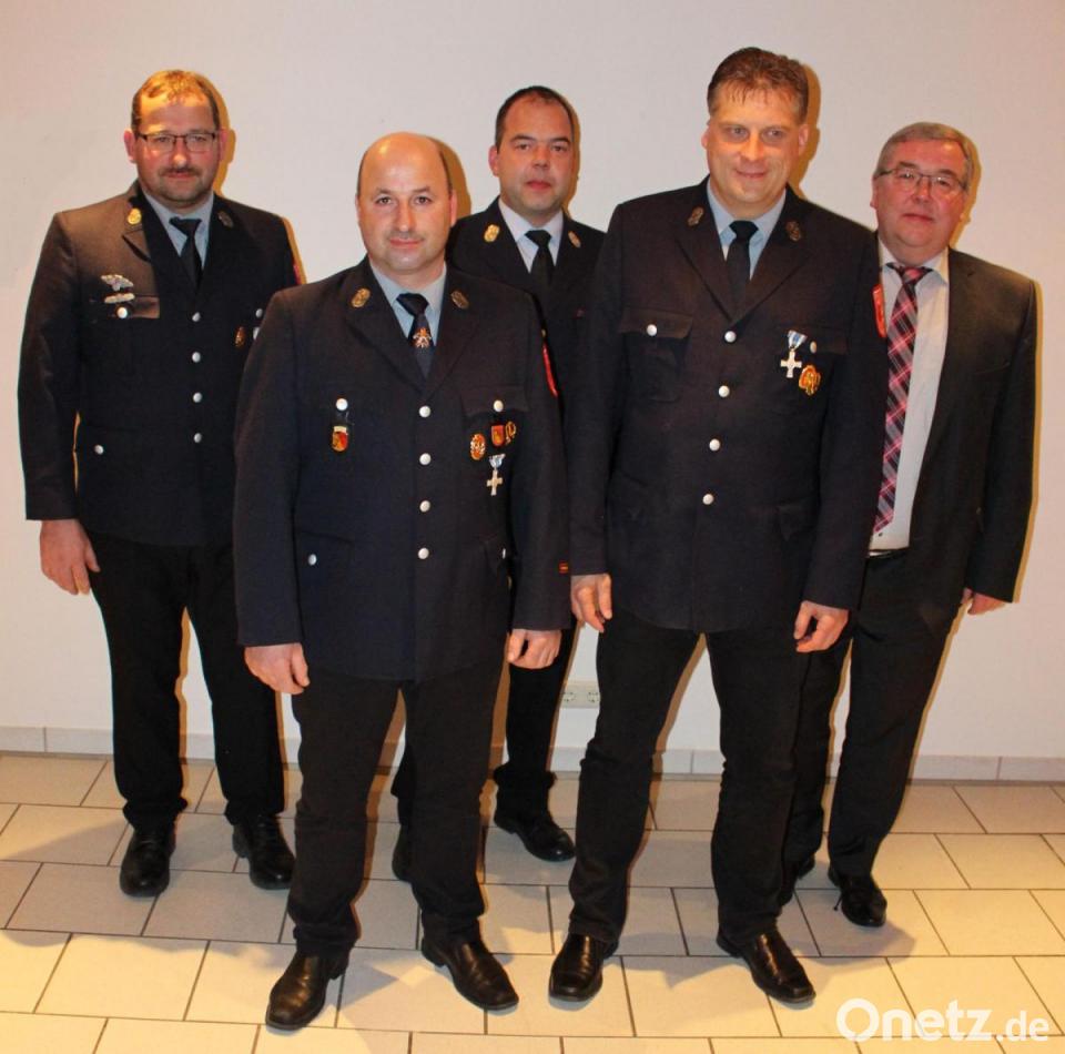 Zweiter Kommandant Christian Heindl, Kommandant Berthold Heindl, Kreisbrandmeister Marco Weiß, Thomas Sehr und Bürgermeister Josef Reindl (von links).