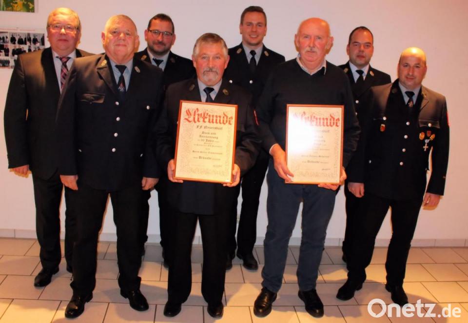 Anschließend standen zwei Ehrungen an. Für 50 Jahre Mitgliedschaft, dabei von 1974 bis 1981 als Zweiter Kommandant, wurde Dieter Zimmermann geehrt. Ehrenmitglied Johann Schorner sen. erhielt eine Auszeichnung für 60 Jahre Vereinstreue. Er war nicht nur aktives Mitglied, sondern auch Kommandant von 1968 bis 1974 und Vorsitzender von 1981 bis 1987. Für ihre guten Leistungen bei Prüfungen wurden geehrt: Wissenstest der Stufe 3: Julian Sehr, Wissentest der Stufe 1: Theresa und Andreas Hagler sowie Stefan Heindl. Berthold Heindl bekam das Abzeichen in Gold-Rot, Thomas Sehr das in Gold-Grün, beide wurden damit für ihr Können in der technischen Hilfeleistung usgezeichnet