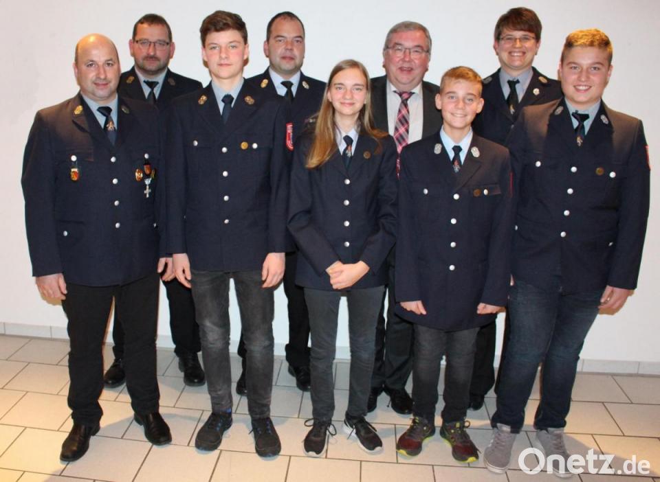 Kommandant Berthold Heindl, sein Stellvertreter Christian Heindl, Julian Sehr, Kreisbrandmeister Marco Weiß, Theresa Hagler, Bürgermeister Josef Reindl, Andreas Hagler, Jugendwartin Julia Mutzbauer und Stefan Heindl (von links).