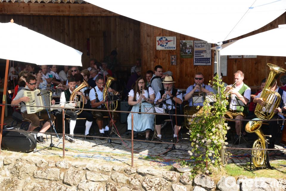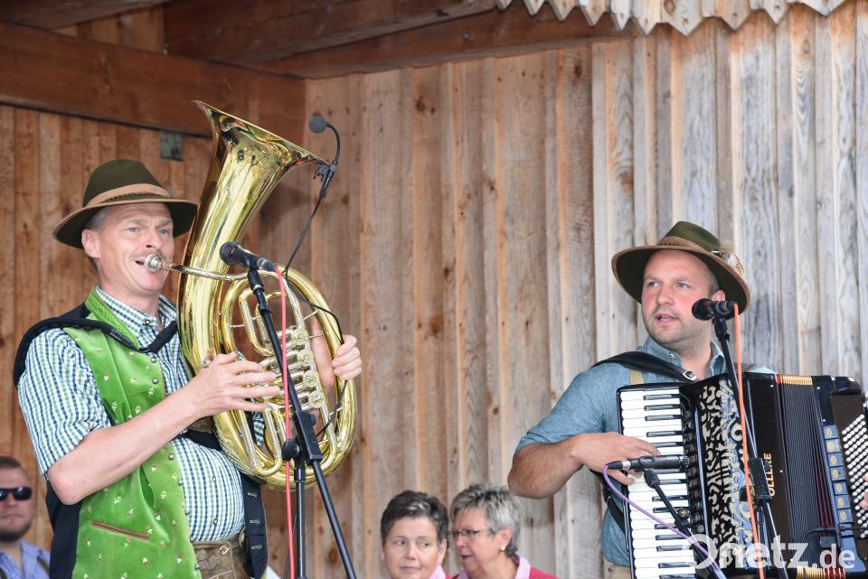 Pünktlich um 15 Uhr eröffneten die „Zwoa Schneidig'n“ das bis in den Abend dauernde Programm. Sie singen vom „wunderschönen Gamsgebirg“, erzählen Witze, um dann wieder mit den „traurig'n Buam“ ein lustiges Lied zum Besten zu geben. Fünf Lieder spielten die Gruppen jeweils bei ihren Auftritten, so auch die musikalischen Gäste aus Weiden, die „Seebauern Moidla“ mit Akkordeon und den hölzernen Löffeln für den Rhythmus. Wild begleitete die zwei Musikantinnen auf der Tuba.