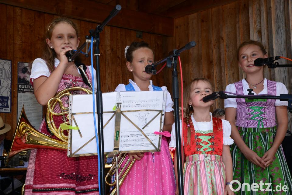 Dann der Auftritt „d'Moidla“, Teresa und Sophie Voit aus Eslarn sowie Leni und Clara Müller aus Waldkirch, die Töchter des „Schneidig´n“ Müller. Das Quartett begleiten jetzt ihre Lieder mit eigenen Instrumenten. Die Kinder saßen in Reihe vor der Bühne, viele ältere Besucher verließen ihre Plätze im Hintergrund, um den Auftritt ganz hautnah zu erleben. Den Abschluss des Durchganges übernahmen dann die „Krainberries“ aus Georgenberg.
