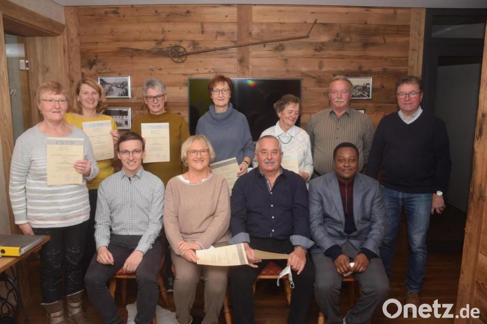 In der Cäcilienfeier im Gasthof Waldnaabtal ehrte der Kirchenchor Neuhaus treue Mitglieder. Christine Schieder für 15 Jahre und Helmut Kippes für 20 Jahre erhielten die Pfarreiurkunde. Urkunden des Bischofs erhielten Margit Sertl, Mathilde Schedl, Liane Rettinger, Hildegard Pschierer, Maria Weigl, Karolina Kreinhöfner für 25 Jahre, Elfriede Bauer für 30 Jahre sowie Irene Sertl und Christa Windschiegl für 35 Jahre. Seit 55 Jahren ist Ulrich Schieder im Kirchenchor. Heinz Uhl und Pfarrer Edwin Ozioko überreichten ihm die Urkunde des Bischofs in Gold.