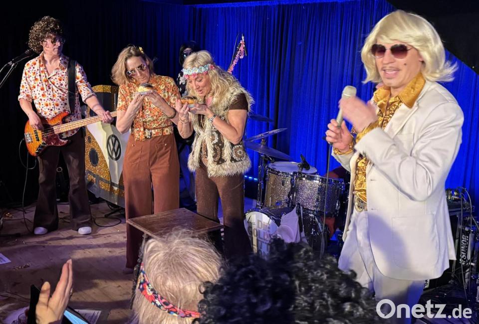 Auch die Band hatte sich kräftig in Schlager-Schale geschmissen. Besonders Sänger, Musiker und Entertainer Markus Engelstaedter hatte sein Bühnenkostüm passend zum Bandnamen „vergoldet“. Ob Perücke, Rüschenhemd, Gürtel, Manschettenknöpfe: alles war in Gold. Dazu Schlaghose, Sonnenbrille und als Pflicht-Accessoire jedes Schlagerstars der Siebziger, der BH eines weiblichen Fans.