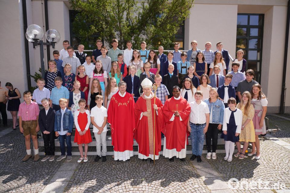 "Herzlich willkommen, lieber Herr Bischof" sangen sie mit der Gitarrenbegleitung von Lehrerin Silvia Wittmann. Auch Mädchen und Buben der Kindertagesstätte St. Josef begrüßten den Würdenträger. Die Kommunionkinder Sophia Kleber, Niklas Bergler, Maximilian Rieder und Julius Hornstein sprachen ein Begrüßungsgedicht und überreichten einen Blumenstrauß. Bei strahlendem Sonnenschein und Glockengeläut zog dann der Weihbischof zusammen mit dem Waldthurner Pfarrer Norbert Götz und Pfarrer John Robert Julius Johnrose aus Neukirchen zu St. Christoph ein. "Der Heilige Geist ist mein bester Freund und wird auf die Firmlinge als Stärkung herabgerufen", sagte Götz einleitend.
