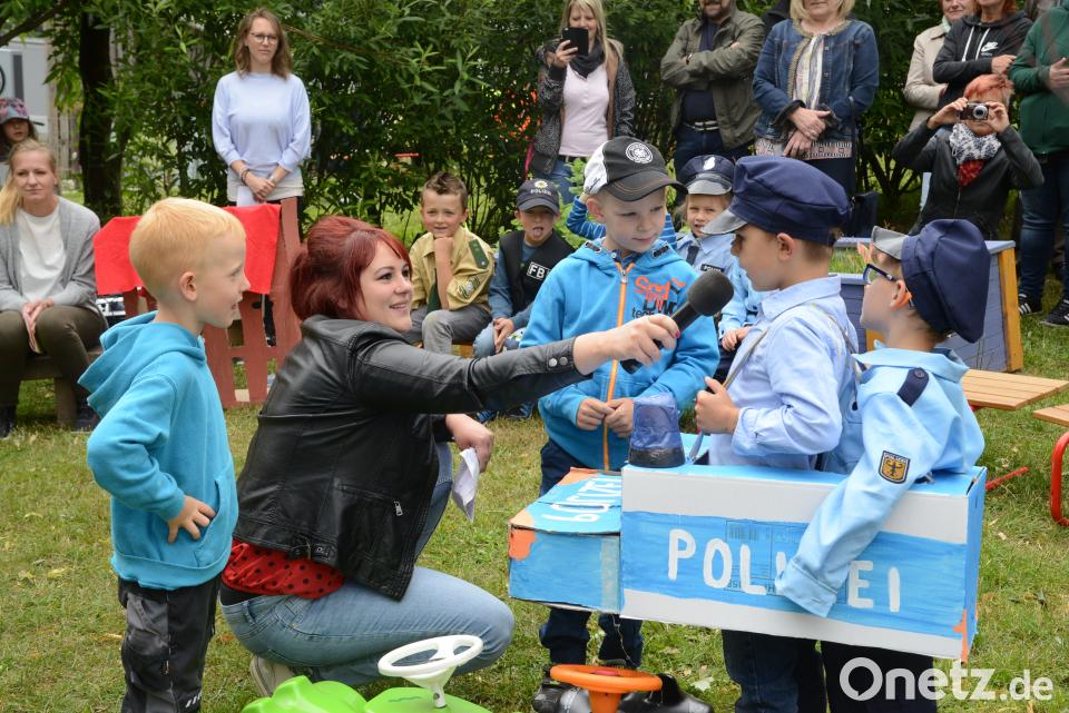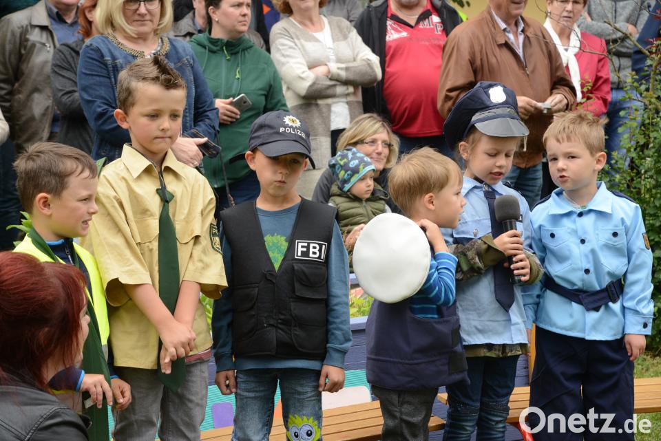 Die Kleinen präsentierten ten dann im lustigen Spiel die Tätigkeiten der Wehren, der Helfer vor Ort und auch des Notarztes. Kita-Leiterin Anja Thalhauser dankte den ehrenamtlich tätigen Helfern für die ständige Einsatzbereitschaft. Mit viel Engagement zeigten die Kinder in ihrer Vorstellungsweise echte Situationen des Lebens auf. Da passierte mit den Bobby-Cars ein Unfall und oft waren sich die Fahrer über die Schuldfrage nicht einig, so dass die Polizei kommen musste. Das "Tatü-Tata" kam auch von Kindern. Die kleinen Polizisten hatten dann richtige Uniformen an. Mit dem Lied frei nach der Melodie "Danke" würdigte der Nachwuchs die Polizisten, die bei Notfällen immer zur Stelle sind. Dazu zeigten die Kinder auch die Notrufnummer 110 auf großen Lettern.