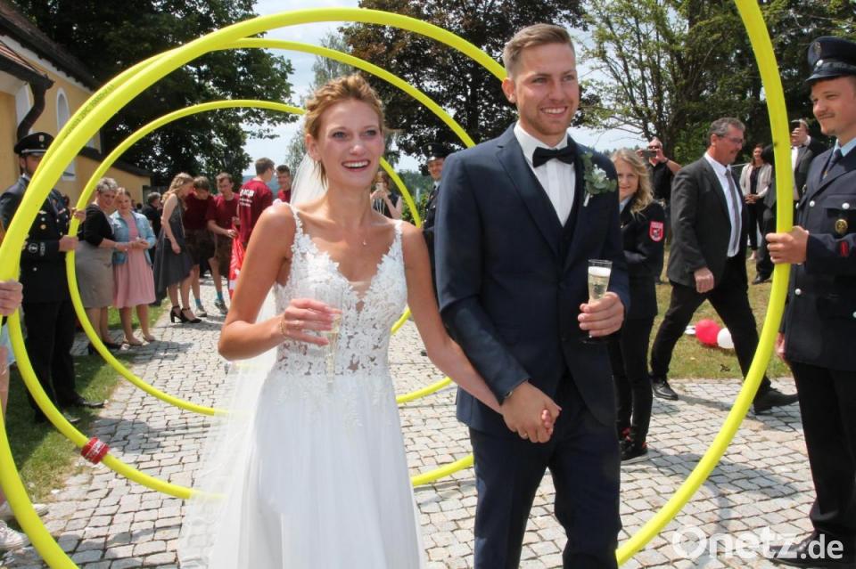 Ein „Hoch“ auf das Brautpaar sangen auch die jungen Leute der KLJB Neukirchen zu St. Christoph sowie die Frauen und Männer der Feuerwehr Neudorf, deren gestellte Aufgabe mit der Kübelspritze kein Problem für Tama und Christoph war. Nur Glück bringen sollten ihnen schließlich weiße Tauben.