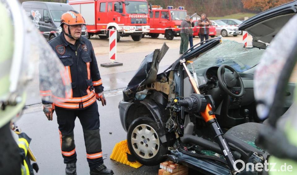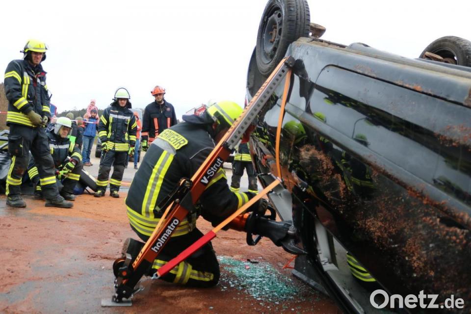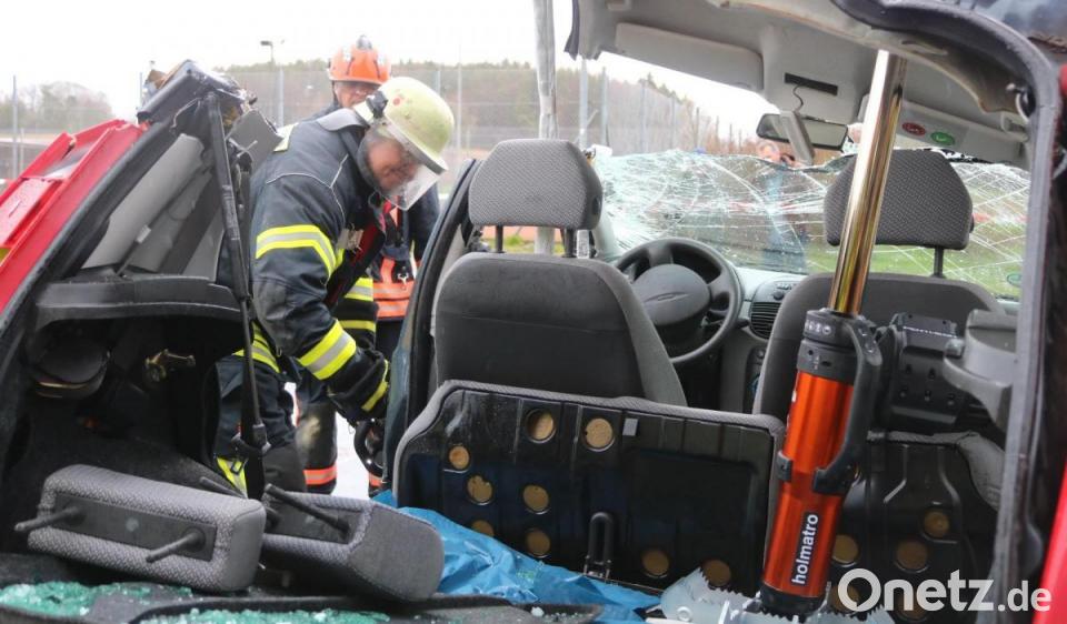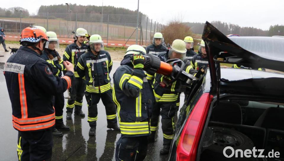 Drei Szenarien brachten die Ausbilder mit nach Neukirchen, welche es jeweils in zwei Gruppen abzuarbeiten galt. Der Schwerpunkt war dabei jeweils die Rettung von eingeschlossenen oder festgeklemmten Personen in bzw. aus einem Pkw. Bei der ersten Station stand das Auto normal auf seinen vier Reifen und musste durch eine große Seitenöffnung zugänglich gemacht werden. Schwieriger wurde es dann bereits bei der zweiten Station, bei der ein Pkw auf dem Dach lag. Es galt, diesen zu sichern und die angenommene Person über einen Zugang durch den Kofferraum zu retten. Bei der dritten und letzten Station lag das Fahrzeug auf der Seite. Durch das Abnehmen des Daches kamen die Helfer schonend für einen möglichen Verletzten ans Ziel. Von A wie Abstützsystem bis Z wie Zylinder waren Gerätschaften im Einsatz. Vor allem der Umgang mit Spreizer und Schere wurde ausgiebig trainiert. Von den sechs Fahrzeugen, die von der Firma Auto Regler aus Edelsfeld zur Verfügung gestellt wurden, blieb am Ende nicht mehr viel übrig.