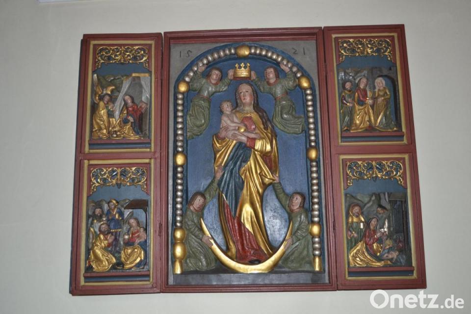 Ein sakrales Kleinod feiert Geburtstag: 1521 - vor exakt 500 Jahren - hat ein unbekannter Künstler den kleinen spätgotischen Flügelaltar geschaffen, der jetzt an der südlichen Langhauswand der katholischen Pfarrkirche St. Peter und Paul steht. Seinen Weg dorthin hat der dreiteilige Altaraufsatz mit geschnitzten, farbigen und goldgefassten Reliefbildern aus dem Leben Marias erst vor nicht allzu langer Zeit gefunden. Über Jahrhunderte bis zur Auflösung des Simultaneums Ende der 1920er-Jahre hatte er seinen angestammten Platz in der jetzigen evangelischen Kirche.