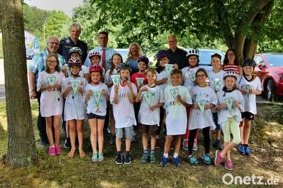 Vor Freude über den bestandenen Fahrradführerschein strahlen die Schüler und nehmen die Wünsche für stets unfallfreies Radfahren von Bürgermeister Winfried Franz, Verkehrserzieher Bernhard Ziegler, Michael Heinz von der Sparkasse Amberg-Sulzbach, Rektorin Birgit Molitor, Verkehrserzieher Uwe Aulinger und Elternbeiratsvorsitzender Ulrike Appel (hinten, von links) entgegen.