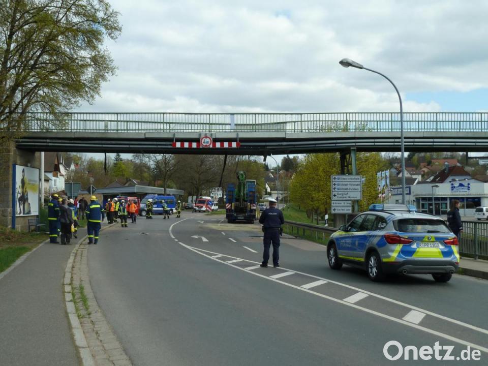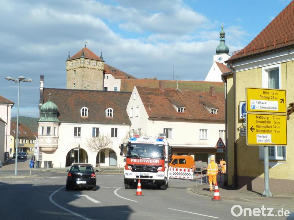 Die Zeitschiene ist unklar, wann die Konrad-Adenauer-Straße wieder für den innerstädtischen Verkehr freigegeben werden kann. „Ein wichtiger Ankerpunkt in der Stadt fehlt damit“, betonte der Bürgermeister. Die Straßensperrung nahmen THW und Feuerwehr Neunburg vor. Sie halfen auch beim Aufstellen der Absperrgitter beim Eingang zum Fußgängerüberweg, die der Stadtbauhof vorbeibrachte. Die Staatsstraße riegelte das Staatliche Straßenbauamt Amberg-Sulzbach ab. Kurz vorher setzte sich das Unfallgespann – Traktor (160 PS) und Transportanhänger mit Liebherr-Bagger (14 Tonnen) – in Bewegung.