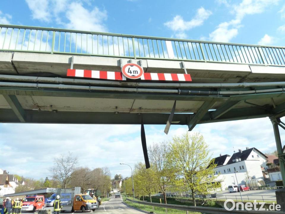„4 m“ steht in großen Lettern auf dem runden Schild am Eisernen Steg beim Vorstadtzentrum. Das müsste der 33-jährige Fahrer eines Traktor-Gespanns eigentlich gesehen haben, als er am Dienstagnachmittag kurz vor 16 Uhr die Staatsstraße 2040/Konrad-Adenauer-Straße stadtauswärts in Richtung Schwarzachtalhalle mit Ziel Neukirchen-Balbini befuhr. Die Ladung auf dem Tieflader wurde ihm zum Verhängnis: Denn der Baggerarm ragte 4,50 Meter in die Höhe und blieb beim Durchfahren hängen. „Er hat die Brücke in Richtung Forstmeister-Berg gezogen“, beschrieb der zuständige Beamte der Polizeiinspektion Neunburg den Vorgang. Dabei verschob sich eine Betonplatte und eine eiserne Seitenstrebe riss sich aus der Verankerung. Spektakulär anzusehen, aber weniger schlimm, waren die vom Bauwerk hängenden Gummibänder, die sich zwischen Beton und Eisen gelöst hatten.