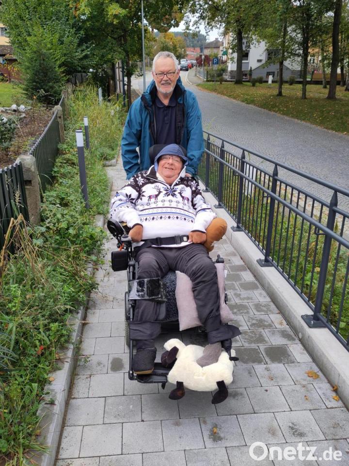 Die Präsentation des barrierefreien Gehwegs zur evangelischen Kirche in Neunburg vorm Wald wurde mit einer Vernissage verbunden. Der querschnittsgelähmte Mundmaler Markus Kostka und sein Begleiter nutzen gleich den neuen Zugang.
