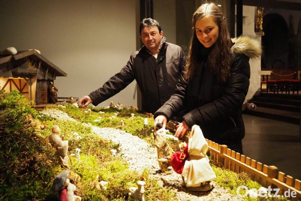 "Heuer war es etwas schwierig mit dem Moos, erst zu trocken, dann schon ein früher Frost", beschreibt Steinsdorfer die Verantwortung, die mit dieser Aufgabe einher geht. Denn ein paar Quadratmeter sind es schon, die hier in der Kirche rechtzeitig vor Weihnachten begrünt werden sollen. Aber Vater und Tochter genießen es, beim Aufbau Hand in Hand zu arbeiten. "Die Weihnachtszeit, das sollte einfach mehr sein als Geschenke", hatte sich der Papa überlegt. Er ist nun nicht der einzige, der diese stillen Auf- und Umbauarbeiten in der einsamen Kirche zu schätzen weiß. "Das gehört einfach zu Vorweihnachtszeit", stellt er fest und deutet stolz auf die Wachsfiguren in richtigen Kleidern, die von Schwester Vianney von den Armen Schulschwestern stammen. "Ein Hirte hat inzwischen einen Fuß verloren", bedauert er. Jetzt muss die Figur eben im Sitzen Schafe hüten. Die Schafe haben es Julia Steinsdorfer besonders angetan. "Die ganz kleinen stelle ich immer zur Mutter, das mittelgroße ist ein wenig verspielt und darf auf die Wurzel." Und die größeren Tiere werden dann schön harmonisch über die Moosfläche verteilt. "Die Julia nimmt es da sehr genau", bestätigt der Papa, der sich um einen gepflegten Weg mit sauberem Kies zum Stall kümmert. Auch weiteres Zubehör wie die Papier-Sterne vom Frauenbund und die Engel aus alten Gotteslob-Seiten gilt es im Hintergrund zu arrangieren, schließlich soll eine Sternennacht die Geburt Christi begleiten.