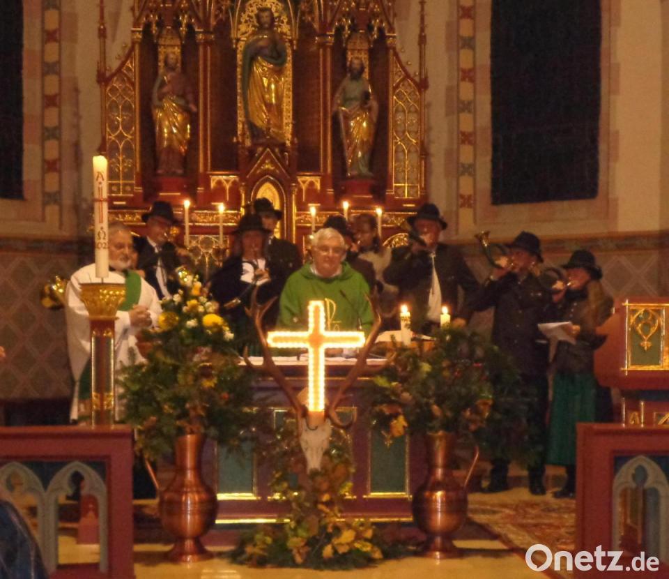 In seiner Predigt ging Diakon und aktiver Jäger Ulrich Wabra auf den Schutzpatron der Jäger, den hl. Hubertus ein. Der junge Adelige ist durch den Tod seiner Frau frustriert und will sich durch die Jagd ablenken. Doch es erscheint ihm ein gewaltiger Hirsch mit einem leuchtenden Kreuz im Geweih. "Gott zeigt uns damit zwei Bilder", schlussfolgerte Wabra. Er stellt sich vor das Tier und beschützt es und gleichzeitig bewahrt er auch den Menschen, dass er auf den falschen Weg geht und immer mehr will, so Ulrich Wabra. "Diese Geschichte will uns zeigen, dass Jagd eine Partnerschaft zwischen Mensch und Tier ist", betonte Wabra. Den Gottesdienst und auch die anschließende weltliche Feier im Krämerhof gestalteten die Jagdhornbläser der Kreisgruppe.