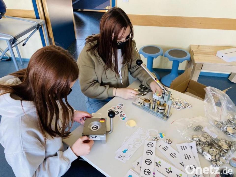 Die Gregor-von Scherr-Realschule setzt ein Zeichen gegen den Krieg in der Ukraine. Die Umrisse verschiedener Friedenstauben zieren die Aula und die Fenster des Schulhauses. Darüber hinaus produzierte das Wahlfach School Spirit geflochtene Freundschafts-Armbändchen in den Farben der Ukraine und Buttons mit der Aufschrift "No War", Peace-Zeichen und Herzen in gelb und blau, die in der Pause für 50 Cent verkauft wurden. Der Erlös geht an die Unicef-Hilfe, die Kinder in der Ukraine unterstützt. Angesichts der dramatischen Nachrichten und Bilder floss auch der ein oder andere zusätzliche Euro Taschengeld in die Spendenkasse.