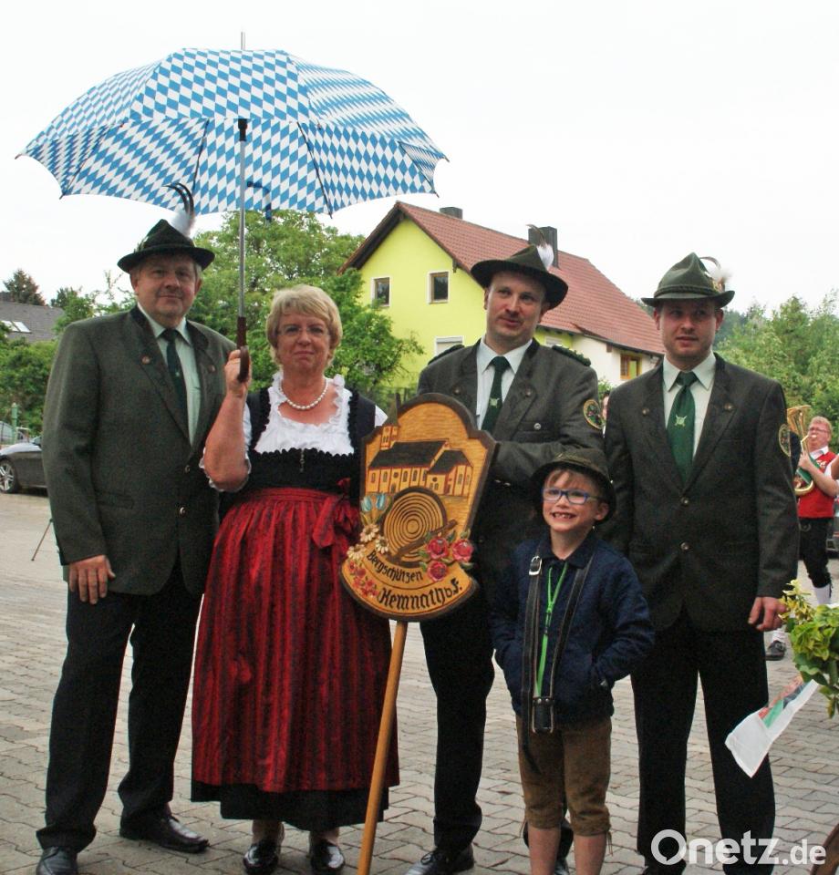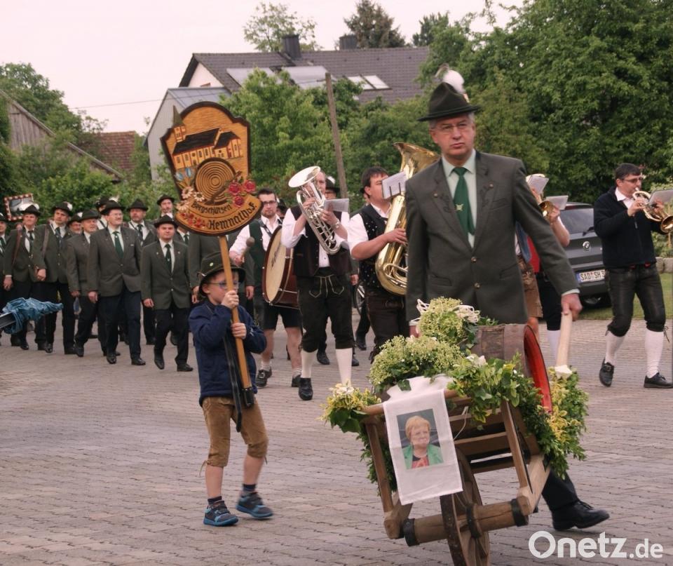 Im Anwesen Probst erinnerte der Festleiter Manfred Scherl, bei der Jahreshauptversammlung 2015 wurde der Gedanke gefasst, dass 2018 das Jubiläum der Bergschützen gefeiert wird. Ein Jahr später wurde ein 22 köpfiger Festausschuss gebildet. Bei mittlerweile zwölf Ausschusssitzungen wurden die Voraussetzungen geschaffen, dass das Fest einen würdigen Rahmen erhält. Bei der sechsten Festausschusssitzung wurde die Frage gestellt wer beschirmt das Fest, da kam nur eine Persönlichkeit der Bergschützen in Frage nämlich die Schützenschwester Renate Probst. Nach dem Musikstück der „Orginal Bergschützen-Böller Feierabend Musikanten“ knieten sich der 1. Vorsitzende Thomas Schießl und sein Stellvertreter Jürgen Scherl auf dem runden Holzbalken und stellten nach einem Verdauungsschnaps mit der Renate Probst die Frage „Wirst du unsere Schirmherrin bei unserem Fest, komm tu dich nicht so lange schenieren, sonst müssen wir beide noch länger am runden Holzbalken knien. Nach diesen Worten spannte Renate Probst den Weißblauen Schirm auf und sagte die Worte „Die heute angetragene Schirmherrschaft ist für mich zur Herzensache geworden, denn ich fühle mich im Kreise der Bergschützen sehr wohl. Danach bedankte sich Manfred Scherl bei der Renate Probst für die Übernahme der Schirmherrschaft. Weiter bedankte er sich von Gerlinde und Arthur Brei dass sie den Holzschubkarren zur Verfügung gestellt haben. Als weitere Termine nannte Scherl das am 10. Juni um 10.30 Uhr vor dem Feuerwehrhaus der Fototermin für alle Vereinsmitglieder in Uniform oder T-shirt ist. Ende Juni/Anfang Juli werden einige Festausschußmitglieder von Haus zu Haus gehen um die Festabzeichen und Biermarken anzubieten. Danach wurde in der Maschinenhalle auf die kommende Schirmherrin Renate Probst gegessen, getrunken und gefeiert, dazu spielte die zusammengewürfelte Band „Orginal Bergschützen-Böller Feierabend Musikanten“.