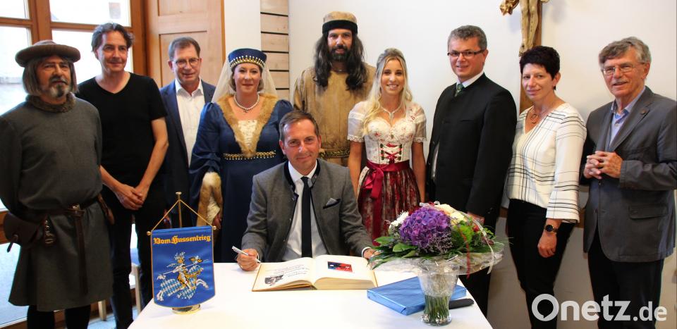 Als Festspiel-Schirmherr durfte sich Raiffeisenbank-Vorstand Thomas Stalla ins Goldene Buch der Stadt eintragen. Seine Unterschrift verfolgen (von rechts) Festspiel-Ehrenvorsitzender Theo Männer, die Bürgermeister Margit Reichl und Martin Birner, Ehefrau Stefanie, das Pfalzgrafenpaar, CSU-Fraktionssprecher Klaus Zeiser, Regisseur Cornelius Gohlke und Festspiel-Vorsitzender Helmut Mardanow.