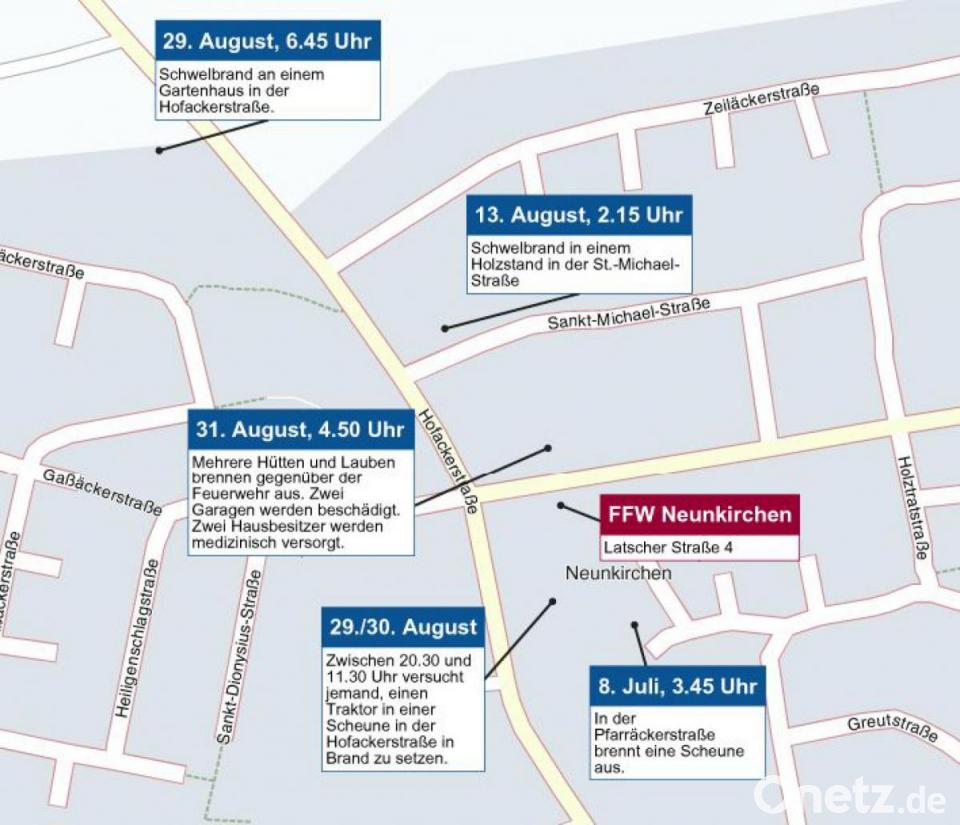 Vor diesen letzten Bränden ereigneten sich drei weitere: Am 8. Juli brannte in der Pfarräckerstraße eine Scheune. Am 13. August entstand an einem Holzstand in der St.-Michael-Straße ein Schwelbrand. Am 29. August legte jemand Feuer an einem Gartenhaus in der Hofackerstraße. Der weiteste Abstand zwischen den Brandorten beträgt 650 Meter. Die Kriminalpolizei geht in allen fünf Fällen von Brandstiftung aus.