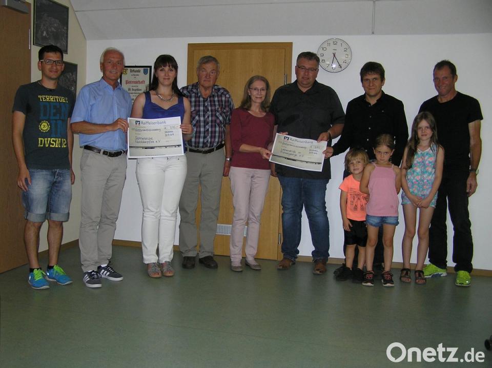 Gemeinsam überreichten Sebastian Schindler (von links), Bürgermeister Peter König und Cornelia Wöhrl von der Raiffeisenbank Oberpfalz NordWest e.G. einen Scheck an die Initiative Sonnenblicke Nordoberpfalz. Eine weitere Zuwendung, die Rolf Heindl und Maria Sippl in Empfang nahmen, erhielt die Lebenshilfe Fichtelgebirge in Marktredwitz. Mit auf dem Bild die weiteren Sponsoren Stefan Plannerer und Helmut Koller mit Kindern sowie Bürgerfestlaufleiter Peter Prechtl.