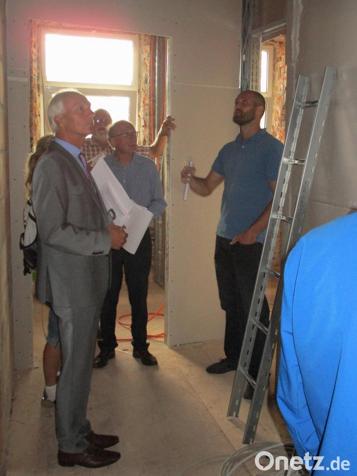 Das Gremium informierte sich über die Räumlichkeiten der zukünftigen Zahnarztpraxis im Obergeschoss. Die Räume zeigen zwar noch nackte Ziegelwände, Schächte und Durchbrüche, aber mit Plänen ausgestattet konnten sich die Gemeinderatsmitglieder bereits ein Bild von der zukünftigen Nutzung der angenehm hohen Zimmer machen. Auch das Erdgeschoss zeigt sich in den Rohbauzustand zurückversetzt, aber hier sollen die mit Stuck verzierte Decken zum größten Teil erhalten werden.