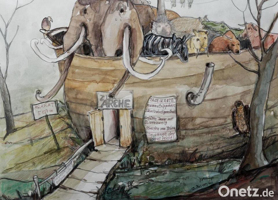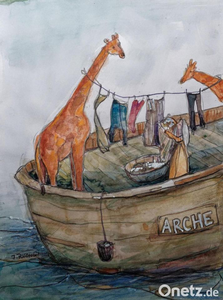 Eine Spezialität sind ihre Comiczeichnungen, etwa die Serie aus der Arche Noah, für die sie dann an endlos langen Nachmittagen mit Freundin Claudia lustige bis böse Titel sucht. So heiße dann ein Bild im tiefen Holzrahmen schon mal "Kreatief". Künftig wolle sie mehr Objekte machen, zum Beispiel aus alten Schuhspannern. Nicht die Bildhauerin, sondern eher die Patchworkerin, die aus den verschiedensten Dingen Neues zusammenstellt, will sie dabei sein. Hier gelte, "witzig muss es sein". Seit sechs Jahren lernt Posorski Tschechisch. Sie spielt Klavier, nur für sich, zum Zeitvertreib. Und sie liest, was ihr unter die Augen kommt. Bei südamerikanischen Rhythmen schmilzt sie geradezu dahin.