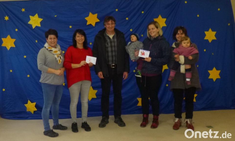Der stattliche Betrag von 380 Euro konnte an Erwin Bösl vom „Familienentlastenden Dienst und Offene Behindertenarbeit Mitterteich“ überreicht werden. Zusammengetragen hatte die Summe von 280 Euro das Kinderhaus Sankt Josef als Martinsspende. Die Krabbelgruppe Spatzennest steuerte 100 Euro dazu bei. Unsere Aufnahme zeigt (von links) Simone Wegmann und Leiterin Daniela Burger vom Kinderhaus, Erwin Bösl sowie Sabrina Greger und Julia Daubner von der Krabbelgruppe Spatzennest.