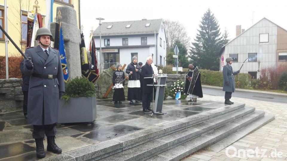 Bei der Gedenkfeier in Neusorg bewegte sich nach dem vom Männergesangverein umrahmten Gottesdienst ein langer Zug angeführt von der Blaskapelle Neusorg mit Pfarrer Paul Ezenwa und vielen Vereinen von der Pfarrkirche zum Kriegerdenkmal. Bürgermeister Peter König betonte dort, dass die Menschen damals erschüttert waren von den Schrecken des Ersten Weltkriegs. Sie hofften, das Gedenken an die Opfer von Krieg und Gewaltherrschaft werde für immer an den Frieden erinnern.