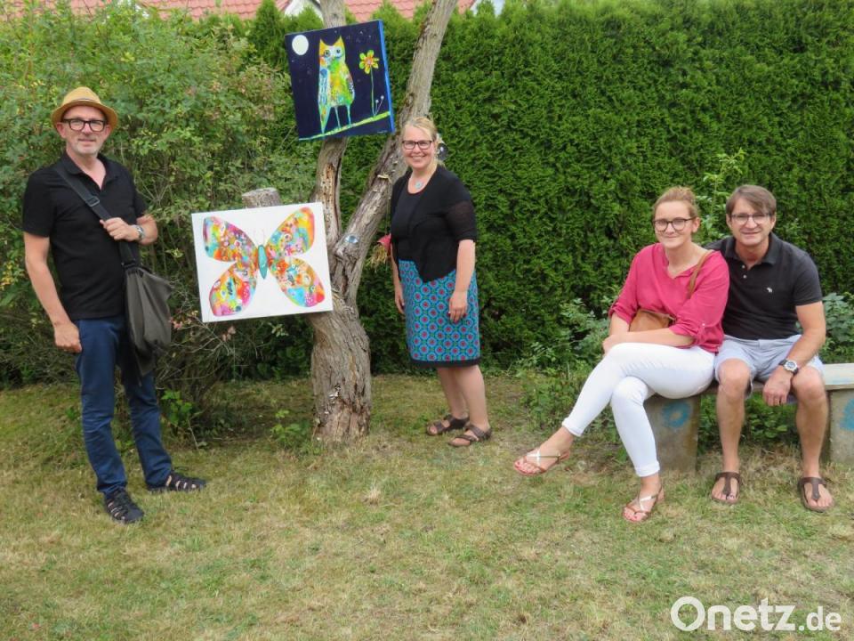 Viel Lob und Anerkennung erntete die Neustädter Hobbymalerin Cheryl Frank bei ihrer ersten Vernissage im eigenen Garten. Bei idealem Sommerwetter präsentierte sie in dort ihre Kunstobjekte. Diese waren wirkungsvoll zwischen den Bäumen, Sträuchern und allerlei Gartenutensilien platziert. Ein Bild mit dem Spruch „Ihr seid mit A-B-S-T-A-N-D die die besten Gäste!“ erinnerte die Besucher am Eingang daran, die aktuellen Abstandsregeln einzuhalten. Zusätzlich war ein Desinfektionsmittel bereitgestellt.