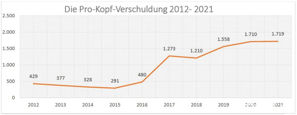 Der Schuldenstand zum Ende des Haushaltsjahres beläuft sich voraussichtlich auf 1.353.200 Euro. und übersteigt damit laut Kämmerer Karl Stopfer den Landesdurchschnitt. Die Pro-Kopf-Verschuldung wird bei 1210 Euro liegen. Jedoch können durch die gute Steuerentwicklung und jährliche Rückführungen von 300.000 bis 400.000 Euro zum Vermögenshaushalt die Schulden relativ leicht und schnell zurückgezahlt werden.