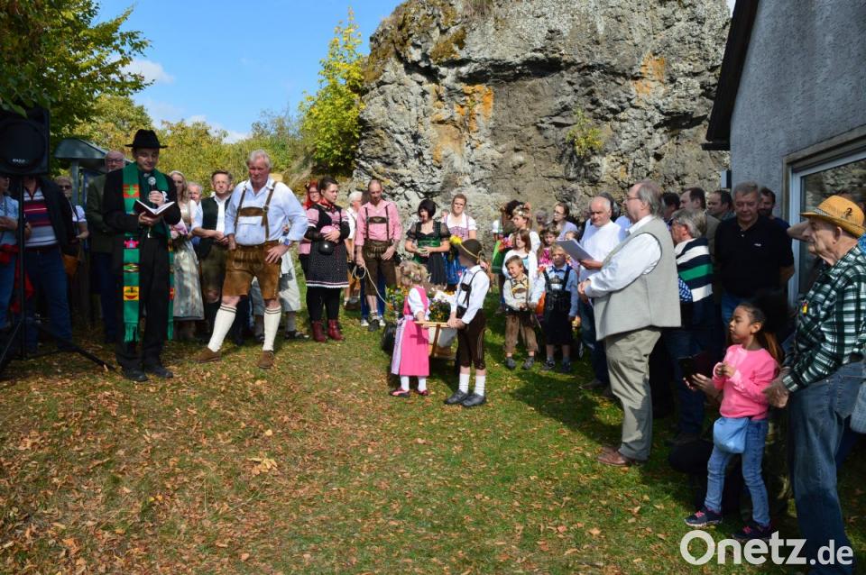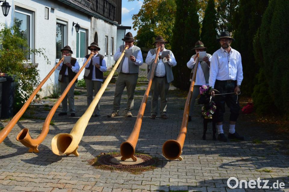 Währenddessen wurden auf dem kleinen Kulm die letzten Vorbereitungen für den Almabtrieb getroffen. Monika Miedel und Pamela Walter verpassten den acht Ziegen ihren Kopfschmuck mit Blumen und Glocken. Die Fichtenhornbläser aus Speichersdorf mit Heinz Schmidt, Gerhard Kreuzer, Ernst Eibisch, Regina Ullmann und Maria Seidl sowie die Männergesangvereine "Kulmianer" aus Neustadt am Kulm und Trabitz, unter der Leitung von Heinz Schmidt, begrüßten die Gäste musikalisch. Seine kurze Andacht hatte Pfarrer Hartmut Klausfelder unter den Psalm 23, "Der Herr ist mein Hirte", gestellt.