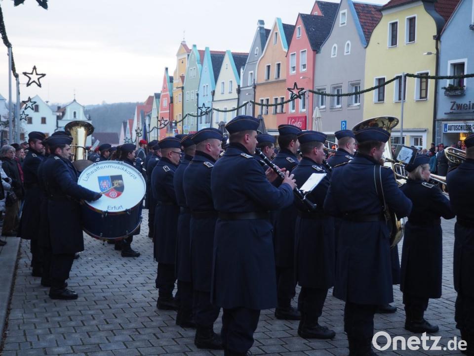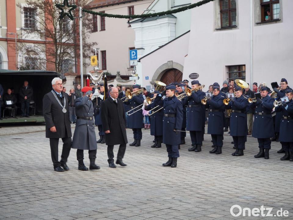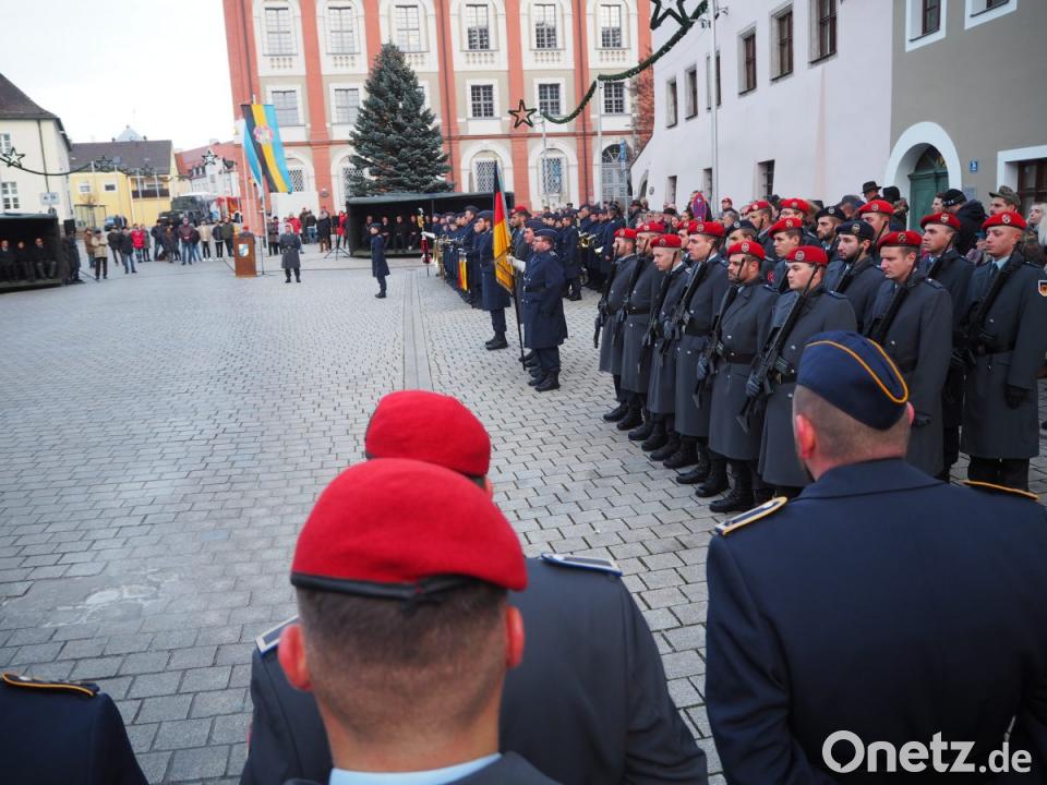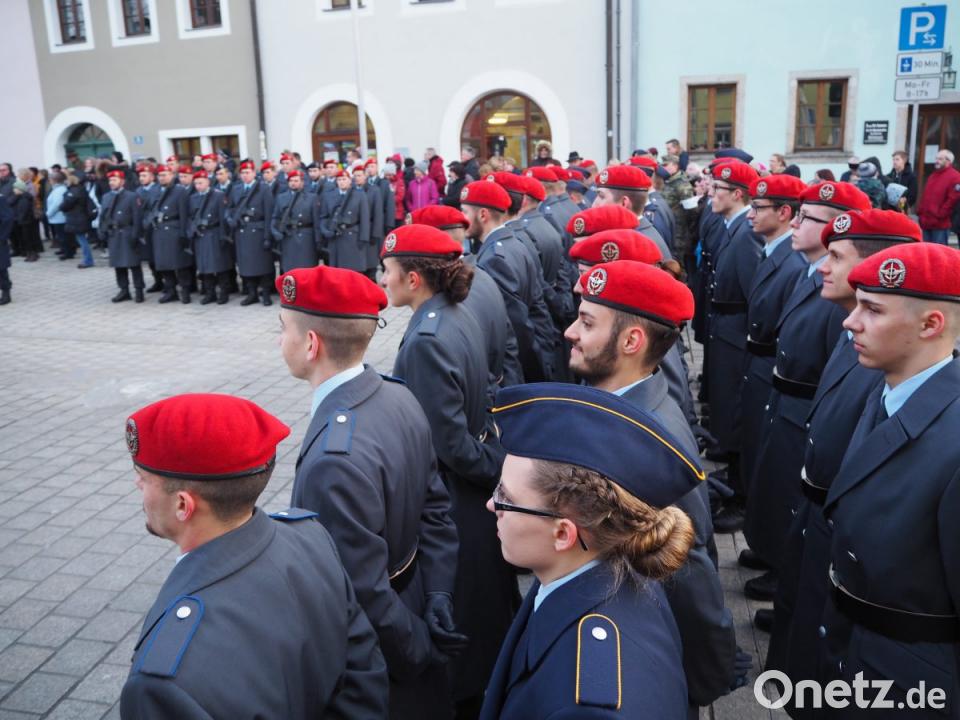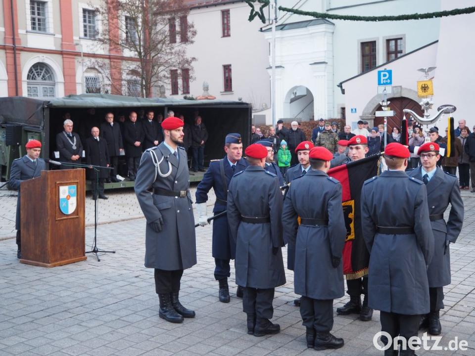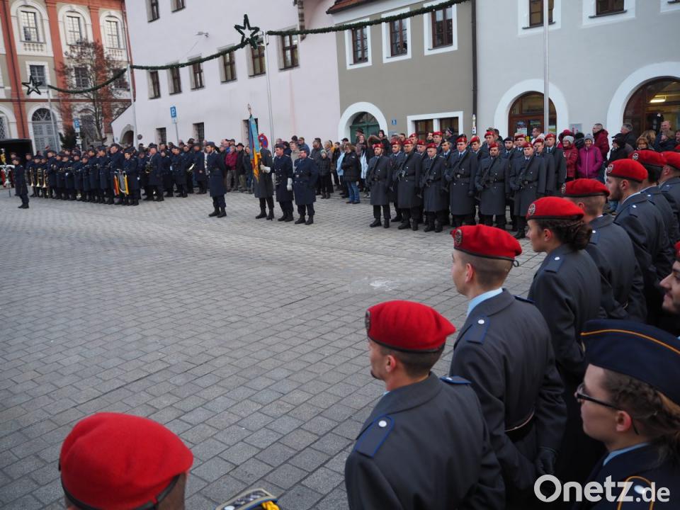 Die Kompanien des Bataillons sowie deren Ehrenzug mit den Truppenfahnen und die Rekruten hatten am Stadtplatz Aufstellung genommen, als das Luftwaffenmusikkorps aus Erfurt unter Leitung von Hauptmann Tobias Wunderle mit ihrem Einzug die Zeremonie eröffnete. Zunächst begrüßte Bürgermeister Rupert Troppmann neben den Ehrengästen Oberstleutnant Alexander Kolb sowie Oberstleutnant Holger Backhaus. Troppmann sprach von einer Wertschätzung, die den Soldaten entgegengebracht werden muss. „Der Schutz des Friedens und unserer Freiheit wird heute in ihre Hände gelegt.“
