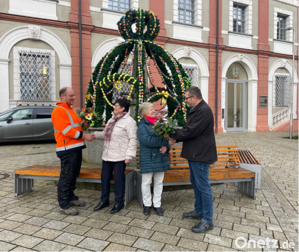 Der Osterbrunnen ziert wieder den Stadtplatz vor dem Landratsamt - bereits zum 34. Mal. Geschmückt wurde er heuer von den Ehrenamtlichen Gabi Fröhlich und Meta Fichtner. "Ungefähr 1 600 bunte Eier hängen an unserem Osterbrunnen, fast alle habe ich handbemalt und lackiert", erzählte Gabi Fröhlich. In einer Scheune haben Gabi Fröhlich und Meta Forstner die Girlanden um das dort gelagerte Eisengestell gewickelt und anschließend mit den Eiern geschmückt. Ganze zwei Tage habe das gedauert. "Heuer hat mir meine Bekannte Meta Fichtner geholfen", freute sich Fröhlich, "seit Corona fehlt es leider ein bisschen an Helfern".