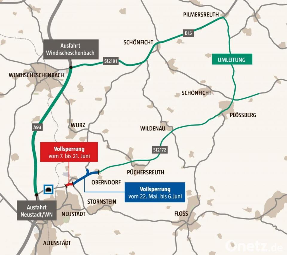 Vom 7. bis voraussichtlich 18. Juni folgt dann die zweite Vollsperrung zwischen der Einmündung nach Neustadt (an der neuen JET-Tankstelle) und der Einmündung der „Störnsteiner Spange“. Auch hier wird die Fahrbahn erneuert. Die Einmündung der „Störnsteiner Spange“ von Osten ist in dieser Phase frei befahrbar. Die Einmündung an der JET-Tankstelle wird mit von Westen her mit Ampelbetrieb geregelt. Die Umleitung während der Vollsperrungen wird großräumig von Plößberg über die Kreisstraße TIR 2 nach Pilmersreuth an der Straße weiter über die B 15 und die Staatsstraße 2182 auf die Anschlussstelle Windischeschenbach der A 93 ausgeschildert. In der Gegenrichtung verläuft die Umleitung analog. Das Bauamt empfiehlt allen ortskundigen Verkehrsteilnehmern, den Bereich weiträumig zu meiden.
