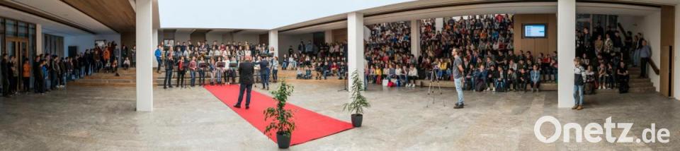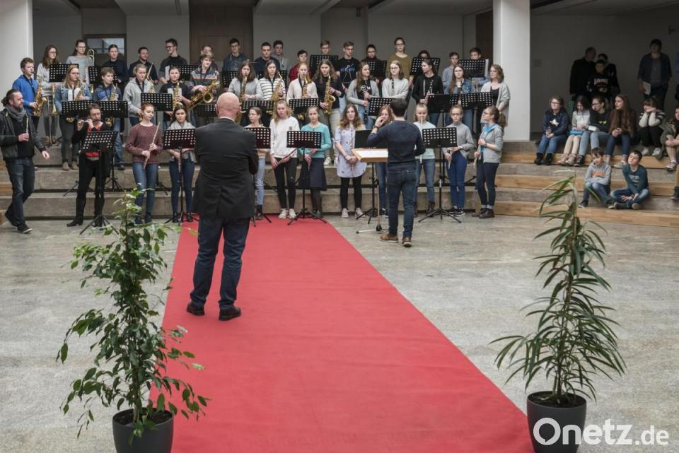 Dort schritt Hochberger, der an diesem Tag 60. Geburtstag feierte, über einen roten Teppich in die Mitte der Aula. Ihn erwartete bereits das große Bläserensemble unter Gleixners Leitung zusammen mit den Instrumentallehrern Markus König und Marion Elling an den Piccoloflöten sowie René Bauer an der Trompete.