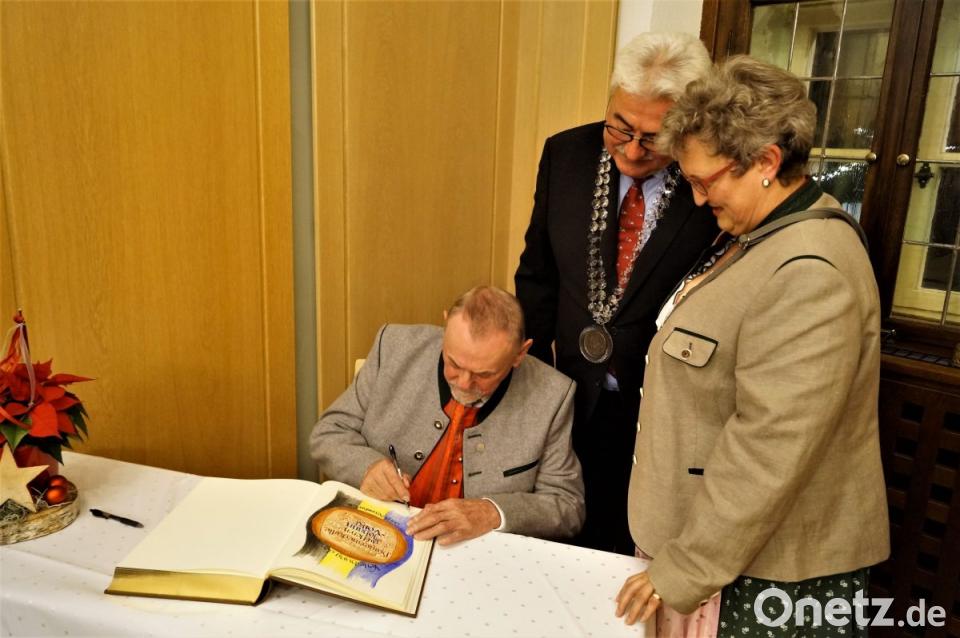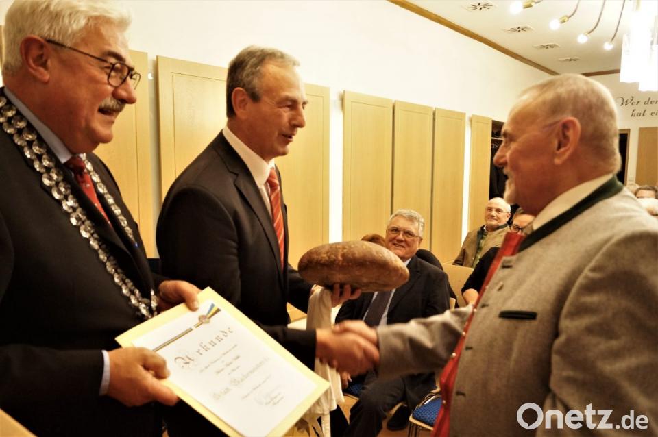 Bevor sich Völkl und die Gäste ins Goldene Buch der Stadt eintrugen, hatte Troppmann noch eine Überraschung parat. Er ernannte Völkl zum städtischen Bäckermeister h.c.: Der echte Bäckermeister und Stadtrat Josef Arnold überreichte ihm einen Laib Brot.