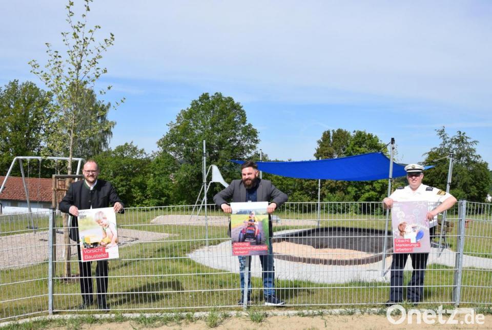 Es gibt drei farbenfrohe Motive: "Obacht Baustelle" zeigt einen Jungen mit einem Spielzeugbagger, auf "Vorsicht Markierungsarbeiten" malt ein Mädchen mit Kreide auf der Straße und "Vorsicht, landwirtschaftlicher Verkehr" stellt einen Buben auf einen Tret-Bulldog dar. Landrat Meier und Polizeihauptkommissar Tobias Wirth als Geschäftsführer der Kreisverkehrswacht übergaben die drei Schilder an Neustadts Bürgermeister Sebastian Dippold am neuen Kindergarten im Baugebiet "Am Rumpler".