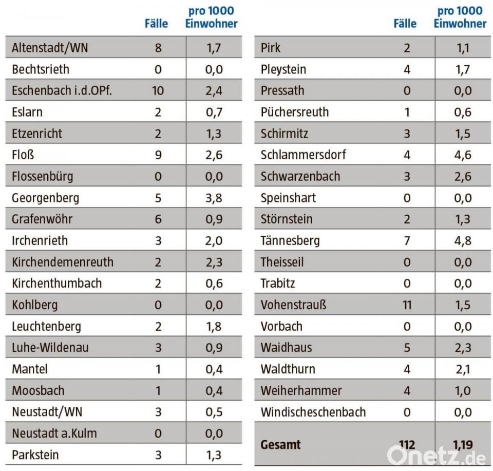 - Die höchste Sieben-Tage-Inzidenz pro 1000 Einwohner weist Tännesberg auf (4,8), gefolgt von Schlammersdorf (4,6), Georgenberg (3,8) und Floß sowie Schwarzenbach (jeweils 2,6). Waldthurn, das zuvor die höchste Inzidenz hatte, liegt nur noch bei 2,1.