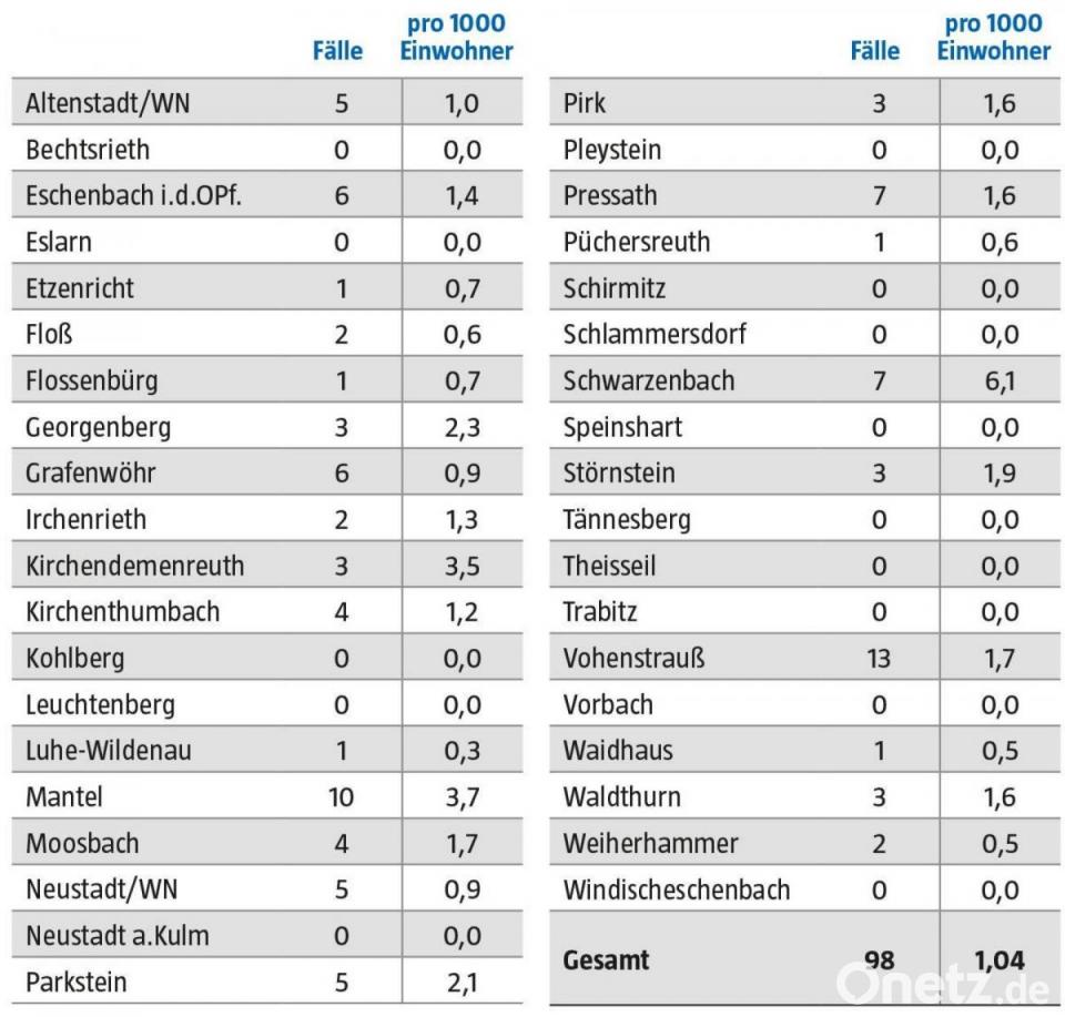 Relativ hoch im Vergleich mit den anderen Gemeinden sind die Zahlen in Altenstadt/WN (5), Eschenbach (6) und Schwarzenbach (7). Die Werte haben sich aber seit dem 22. März kaum verändert.