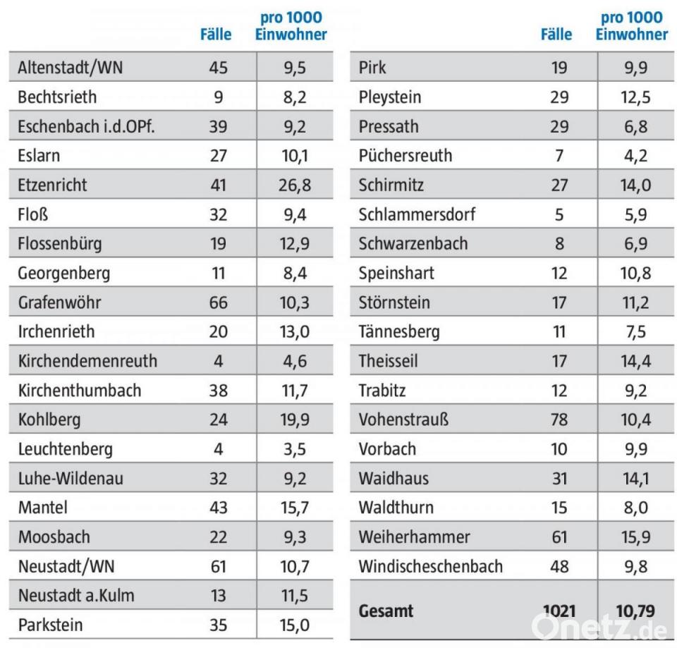 Ebenfalls in der Gruppe der meisten Fälle dabei sind Neustadt/WN und Weiherhammer, wenn auch mit leicht abnehmender Tendenz.