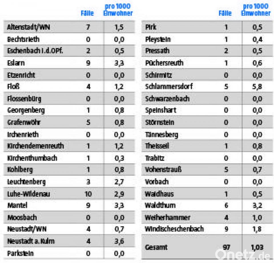 - Die höchste Sieben-Tage-Inzidenz pro 1000 Einwohner weist Schlammersdorf mit 5,8 auf, gefolgt von Neustadt am Kulm (3,6), Mantel und Eslarn (jeweils 3,3), Waldthurn (3,2) sowie Luhe-Wildenau (2,9).