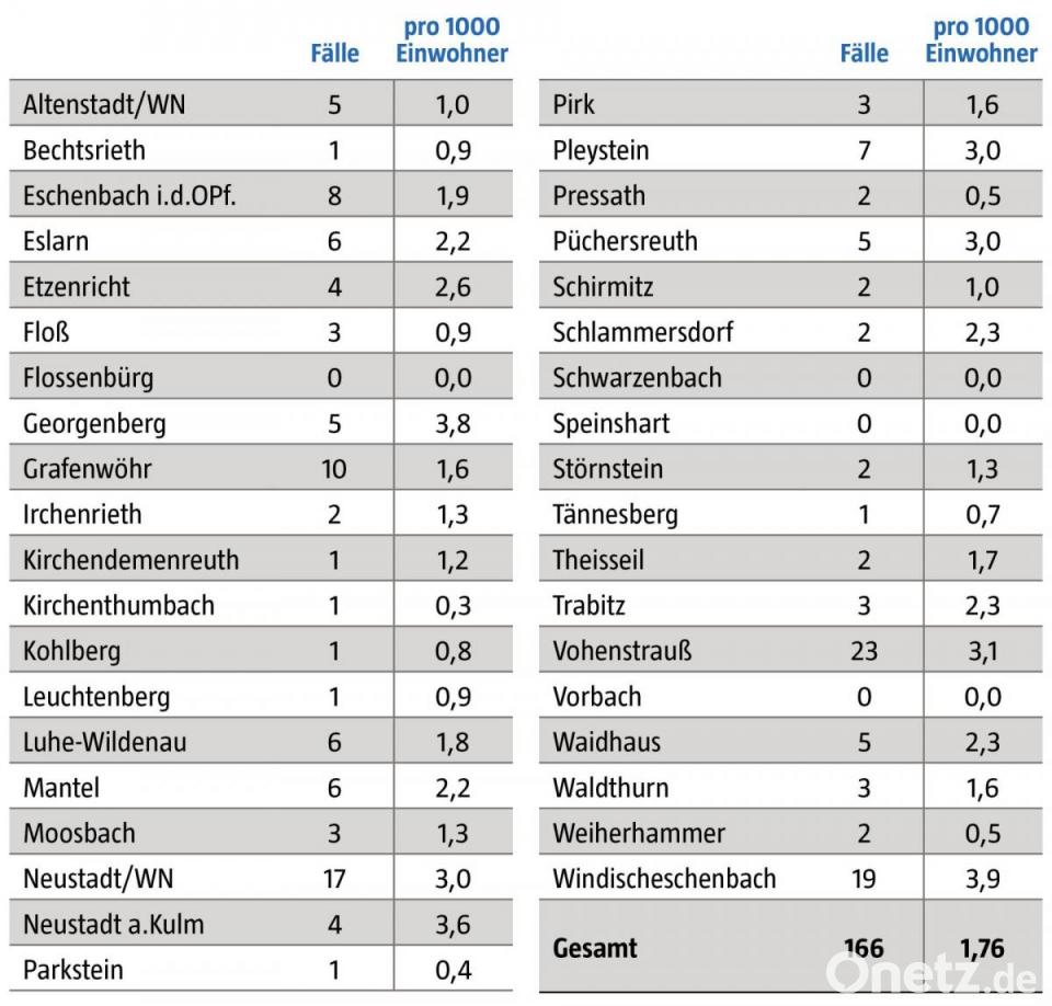 Einen Rückgang der Fälle gibt es in Floß (von 6 auf 3), Pleystein (von 11 auf 7) und Waidhaus (von 8 auf 5). Bei allen weiteren Kommunen schwanken die Zahlen geringfügig. Konkrete Hotspots lassen sich nicht ausmachen. Auch Seniorenheime sind nicht betroffen.