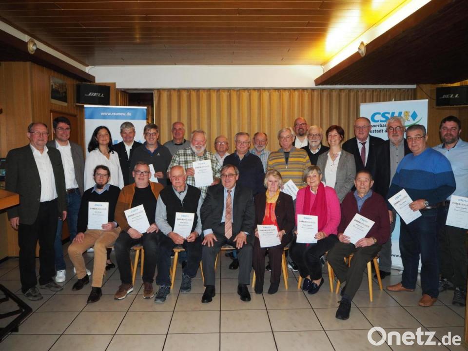 Der Neustädter CSU-Ortsverband hat nach einer dreijährigen Pause viele treue Mitglieder geehrt. Vorsitzender Rolf Hilgart dankte ihnen und betonte seinen Respekt vor diesen vielen Jahren. Mit Bezirkstagsvizepräsident und Weidens Bürgermeister Lothar Höher zeichnete Hilgart die Jubilare aus. 10 Jahre: Petra Troppmann; 15 Jahre: Julian Gröger, Thomas Hauer, Michael Hierold, Stefan Klar, Sandro Schäffler, Thomas Schneeberger und Oliver Völkl; 20 Jahre: Eduard Bauer, Gabriele Fröhlich, Roswitha Jobst, Georg Liebl und Birgit Trottmann; 25 Jahre: Johann Eiszrich, Hans-Jürgen Herlitze, Rolf Hilgart, Hans Völkl und Renate Weiß; 30 Jahre: Wolfgang Gebhardt; 35 Jahre: Josef Arnold, Wolfgang Fürnrohr, Quirin Gierisch und Johann Stich; 40 Jahre: Helmut Fukerider, Bernhard Lang, Günther Michler, Wolfgang Siller, Bernhard Steghöfer, Helmut Troppmann, Rupert Troppmann, Karl Wittmann und Reinhold Zapf; 45 Jahre: Ludwig Fritsch, Rainer Herzog, Bernhard Knauer, Anton Korsche, Peter Pöllath, Josef Puckl, Reinhard Siegel und Johann Simmerl; 50 Jahre: Rudolf Bäumler, Michael Hauer, Reinhard Hecht, Wolfgang Krauss, Hermann Müller, Annemarie Nachtmann, Johann Schieder und Alois Zehrer; 60 Jahre: Max Fischer und Hubert Jobst; 70 Jahre: Anton Binner.