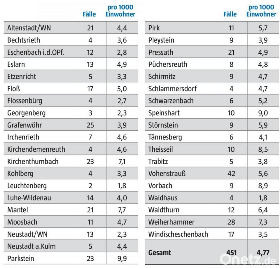 - Die stärksten Veränderungen im Vergleich zur Vorwoche gab es in Altenstadt/WN (-23 Fälle), Weiherhammer (-22), Neustadt/WN und Windischeschenbach (je -21).