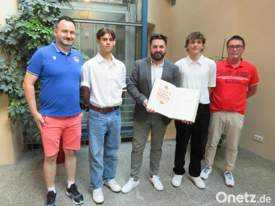 Die Basketballabteilung der DJK Neustadt ist ein Aushängeschild der Kreisstadt. Zwei Nachwuchsspieler konnten jetzt mit dem Oberpfälzer Team mit dem Gewinn der deutschen Vizemeisterschaft U16 Geschichte schreiben. Mit einem Empfang im Rathaus, dem Eintrag ins goldene Buch der Stadt und einem Zuschuss für die Sportausrüstung belohnte Bürgermeister Sebastian Dippold zwei Nachwuchsspieler der Basketballabteilung der DJK Neustadt. Bürgermeister Dippold begrüßte Luis Enzmann und Felix Enzmann, mit ihren Familien und Trainer Gabi Ionescu, den Vertretern der Stadtratsfraktionen und Sportreferent Wolfgang Schwarz im Sitzungssaal. "Die Stadt und auch ich persönlich bin sehr stolz auf euch", sagte Dippold. "Ihr habt den Sprung vom Breitensport zum Spitzensport geschafft. Mit dem Gewinn der deutschen Vizemeisterschaft der U16 habt ihr den Namen der Stadt und eurem Stammverein der DJK Neustadt große Freude beschert." Sportreferent Wolfgang Schwarz freute sich über den Erfolg, den die Nachwuchssportler erreicht haben. Ein gemeinsames Essen in der Stadthalle rundete die Ehrung ab.