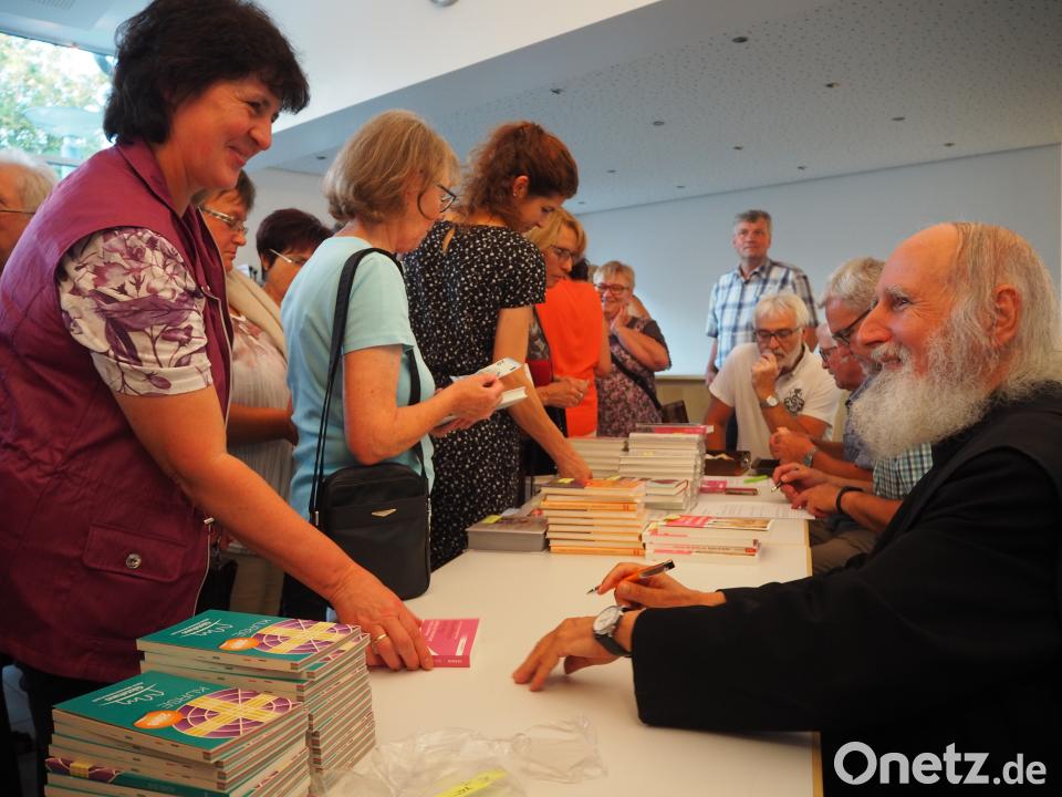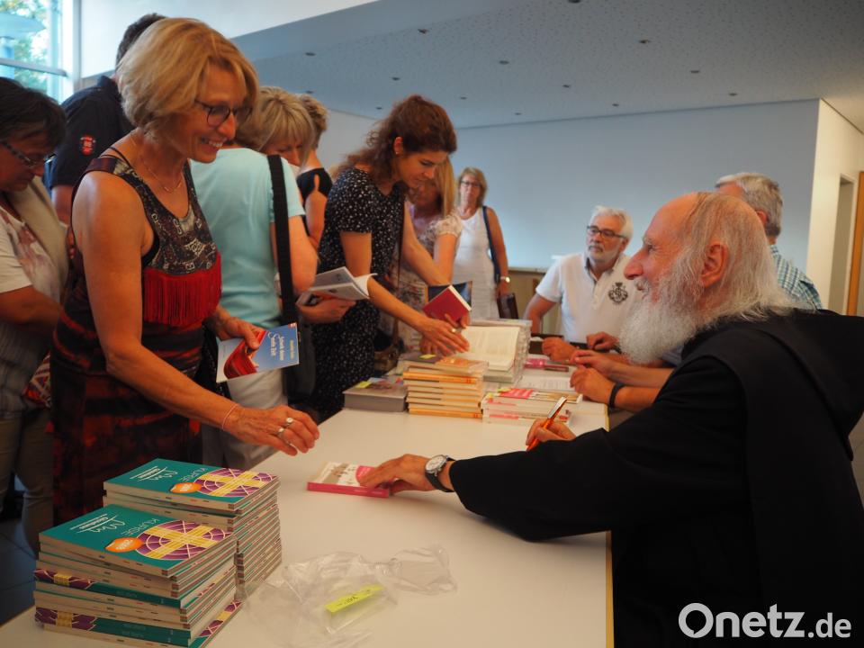 Nach etwa einer Stunde freiem Vortrag hatten die über 200 Gäste keine Fragen mehr. So konnte Pater Anselm nach einigen nachdenklichen Vergleichen in seinem Abendritual ein Abendgebet sprechen, das schon über 1600 Jahre alt ist: „Herr, kehre ein in dieses Haus und lass deine heiligen Engel darin wohnen. Sie mögen uns in Frieden behüten. Und dein heiliger Segen sei für alle Zeit über uns und um uns und in uns. So bitten wir in Christus unserem Herrn, Amen.“ Gerne signierte er anschließend einige seiner zahlreichen Bücher.