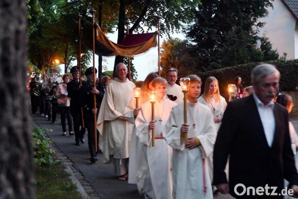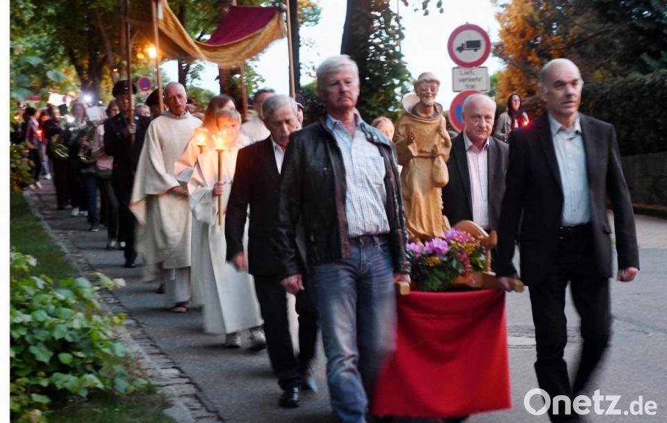 Nachdem Corona zwei Jahre das Felixfest ausgebremst hatte, war am Samstagabend die Wallfahrtskirche sehr gut besetzt. Der Auftakt gehört traditionell der Stadtpfarrei St. Georg. Im Abendgottesdienst, den Stadtpfarrer Josef Häring gemeinsam mit Guardian Pater Stanislaus sowie Pater Stanislaus Strojecki aus Uganda und Kaplan Pater Rafau zelebrierte, erinnerte der Geistliche Rat in der Predigt an den Bruder Felix, der tagaus, tagein als Almosensammler in Rom unterwegs war. „Er war ein Vorbild der Einfachheit, der Demut und Geduld.“ Genauso wie der große Religionsphilosoph des 20. Jahrhunderts, Eugen Biser, dem Häring seine Predigt widmete, ließ der heilige Felix sein Herz von Jesus berühren. Nach der Eucharistie bewegte sich bei einbrechender Dunkelheit eine lange Lichterprozession mit der Statue des Heiligen aus Cantalice und der Dritte Orden mit der Standarte, den Kommunionkindern in ihren Festgewändern und der Stadtkapelle unter Leitung von Karl Wildenauer durch die illuminierte Felixallee. Vor der geschmückten Bildkapelle empfingen die Gläubigen den eucharistischen Segen. Durch den Felixwald zogen sie betend und singend zurück zur Felixkirche.