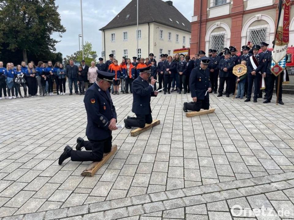 „Ich weiß, ihr wollt uns heute fragen, was euch auf dem Herzen liegt, dass ihr uns wieder als Paten kriegt. Doch bevor wir euch erhören, müsst ihr euch bewähren und nach alter Vätersitte, vortragen eure Patenbitte“, begrüßt Zischka die Altenstädter Wehr. Neustadts Zweiter Vorsitzender Maximilian Schwarz fordert anschließend die Altenstädter Vorstandschaft Wolfgang Müller und Gottfried Amschl und den Zweiten Kommandanten Markus Lindner zum eigentlichen Teil des Brauches auf. „So kniet euch hin, seid nicht eitel, auf dieses harte, hölzerne Scheitel“.
